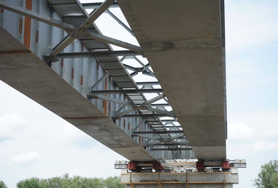 На объекте ведется третий — финальный — этап надвижки пролета. Вес металлоконструкции составляет 980 т. Чтобы собрать эту внушительную металлическую конструкцию, был смонтирован стапель — площадка для сборки и укрупнения элементов моста. Позади стапеля установлены два гидравлических домкрата, которые и приводят пролетное строение в движение. Длина конструкции — 78 м, ее окончательная надвижка на опору должна быть завершена в течение недели.