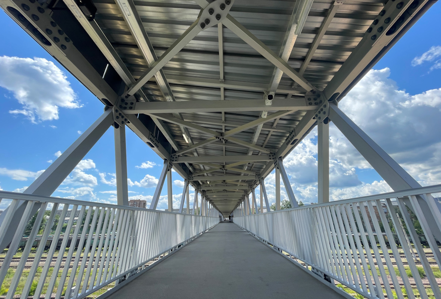 Сооружение выполнено из пяти пролетных строений и двух сходов, оборудованных лестницами и лифтами грузоподъемностью по 630 кг. Дополнительно сходы оборудованы аппарелями, по которым удобно перекатить самокат или велосипед. Это уже седьмой алюминиевый пешеходный мост в Красноярске и первый, проходящий над Транссибирской железнодорожной магистралью